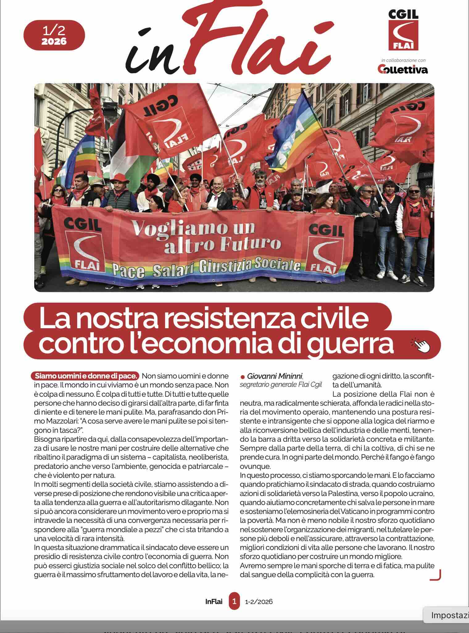 Una riflessione sul mondo senza pace in cui viviamo, sulla necessità di agire per costruire alternative e sul ruolo del sindacato presidio di resistenza civile contro l’economia di guerra apre il numero 1-2 del 2026 di Inflai, nell’editoriale di Giovanni Mininni, segretario generale Flai Cgil.