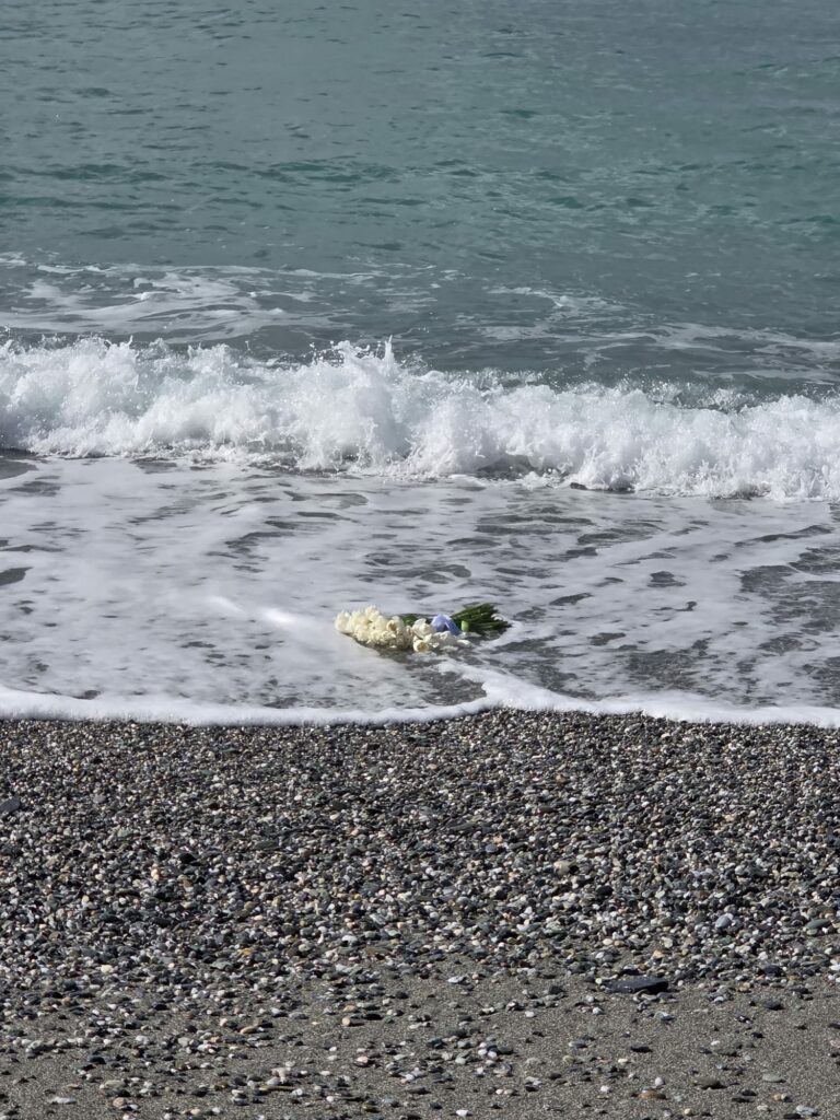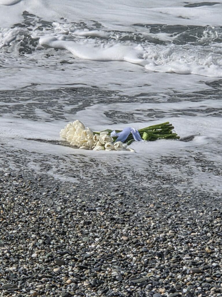 I fiori bianchi, affidati al mare blu, sotto un cielo celeste appesantito da gonfie nuvole grigie, sono stati poi spinti al largo da un vento che fischia, e che non vuole smettere di fischiare.